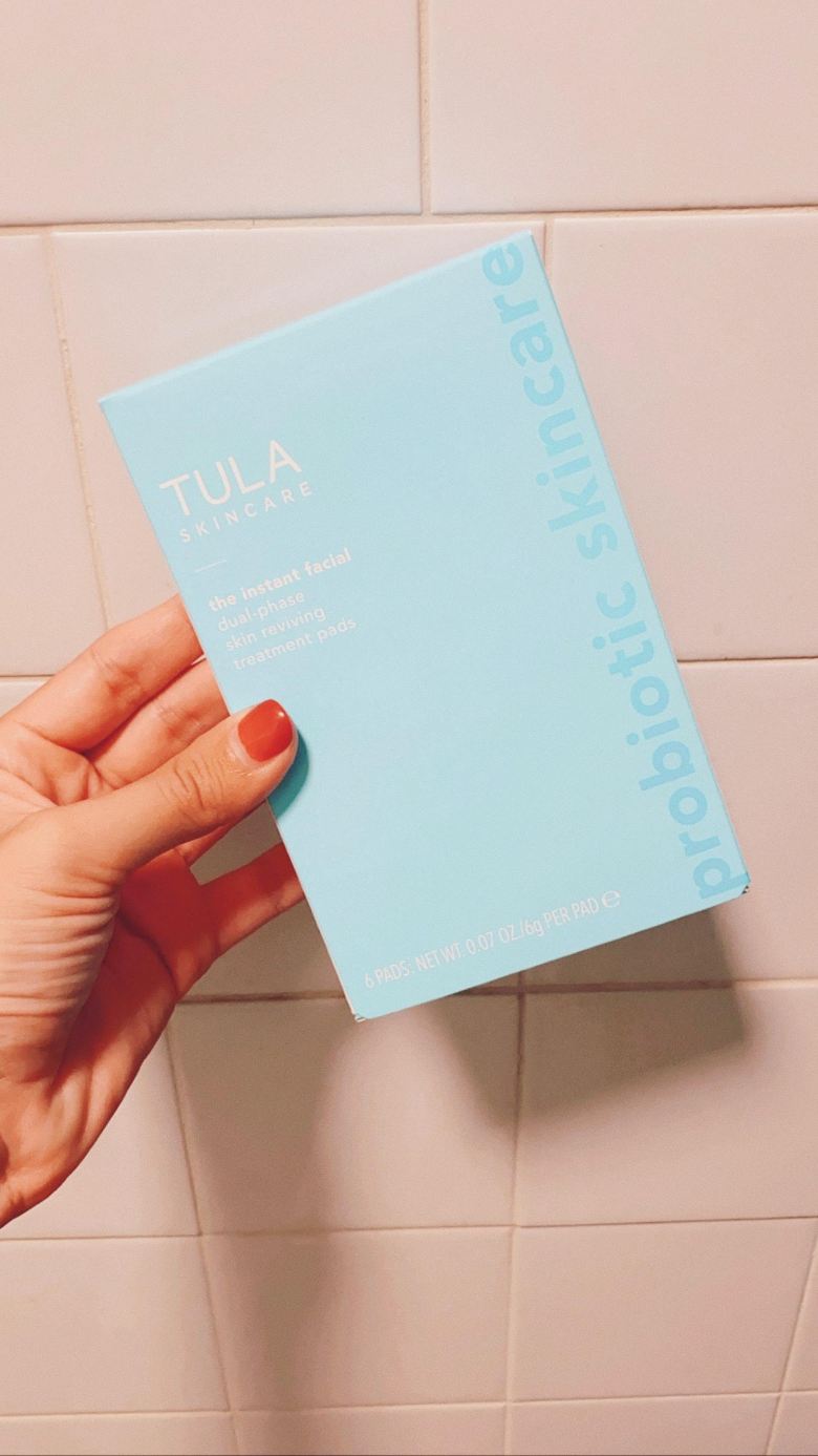 and I was VERY interested. Since we’re friends, I asked her if she actually liked it (LOL, ya just never know these days), and she had nothing but great things to say. I ordered the 6 pack as a test, and when they arrived I tried it that night. GUYS. This might be my FAVORITE product I’ve ever purchased from Tula. I love the serum on one side of the pads, and an exfoliate on the other side. I noticed a difference in my skin IMMEDIATELY after use. Smoother, brighter, it was just GREAT. The directions say 1-2 times a week, so it’s definitely in my weekly routine!